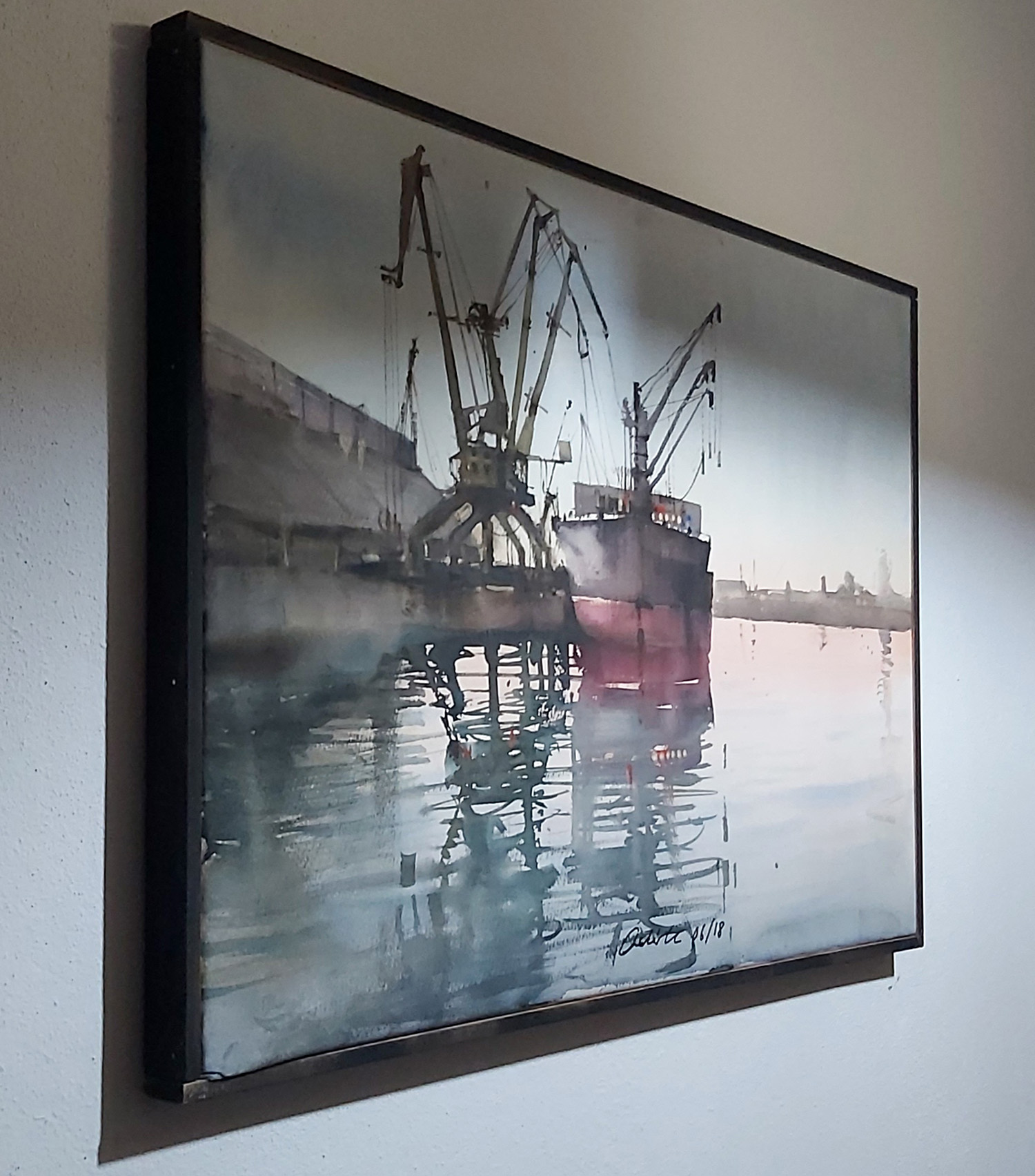 • Obra tensada sobre bastidor de madera y enmarcada con listón de madera.
